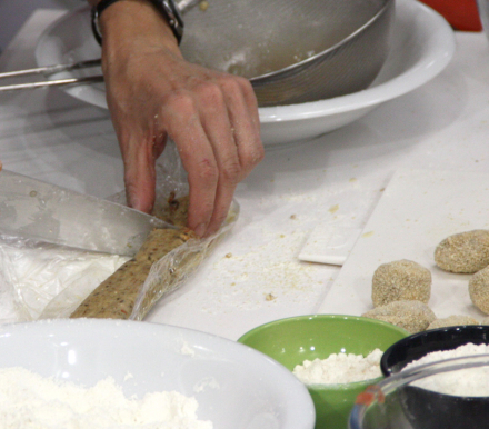 - Omplim la màniga pastissera i amb el filtre de 24 mm especial per fer croquetes (kit per fer croquetes) fem uns cilindres de pasta sobre paper film. Enrotllem els cilindres amb el paper.