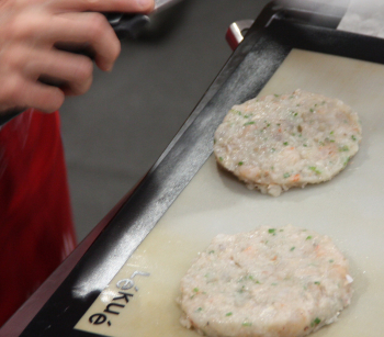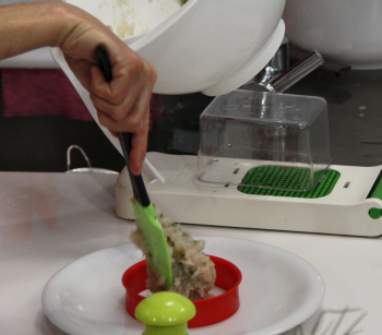 - Salpebrar i afegir els pinyons, els 20 mls de caldo de peix i el Gelburguer (1 culleradeta de Gelburguer per cada 100 grams de pasta d'hamburguesa) fins a obtenir una pasta homogènia i deixar reposar mínim 20 minuts.