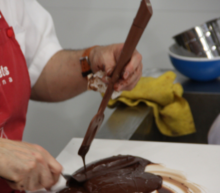 4. Templem la xocolata, això vol dir abocar la xocolata sobre el marbre o el silestone de la cuina i amb l'ajuda d'un termòmetre espàtula remenar fins que arribi a una temperatura de 27º .