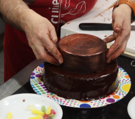 8. A la base del pastís (el pa de pessic) posem les llaminadures o sorpreses al centre i tapem amb el motlle petit i repetim l'operació amb el més petit. Muntar els tres pisos.