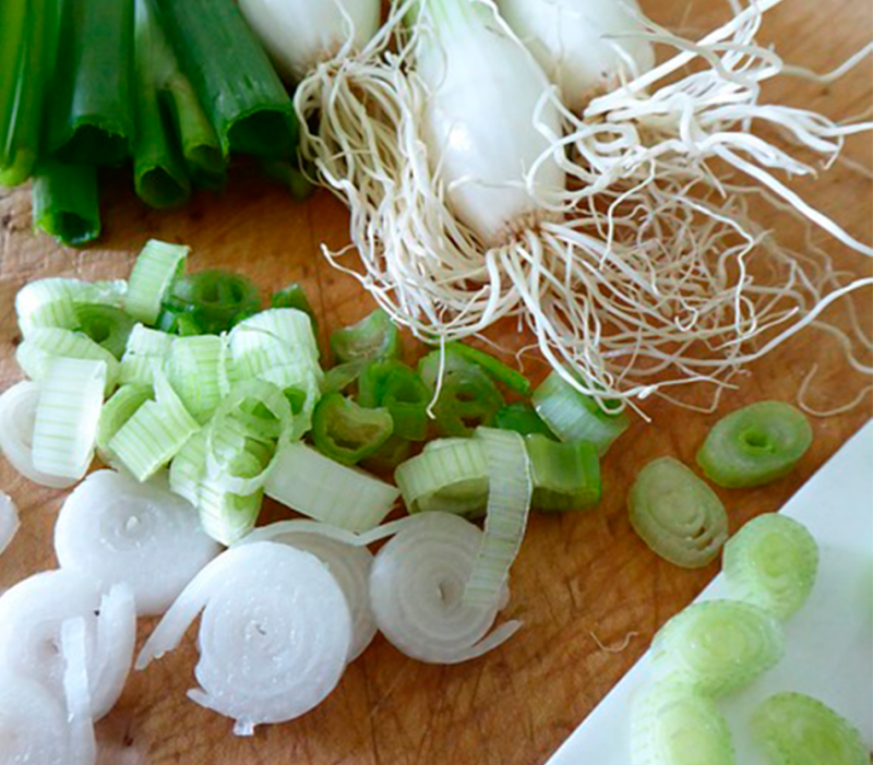 - Rentar i tallar la part blanca els porros ben fines.