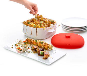 Amb aquest nou estri podem preparar broquetes de carn, peix, verdures ... de forma neta i còmoda al microones.