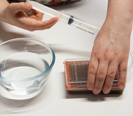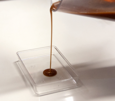 - Una vez reposada, introducir la mezcla de líquido con sabor y alginato en una jeringa o en el depósito de la caviarera (caviar box, que nos permite realizar 90 esferas).