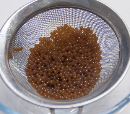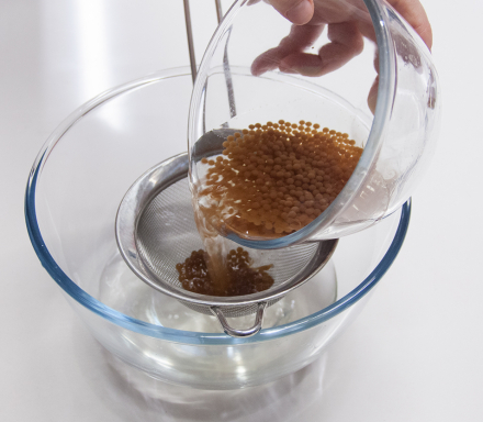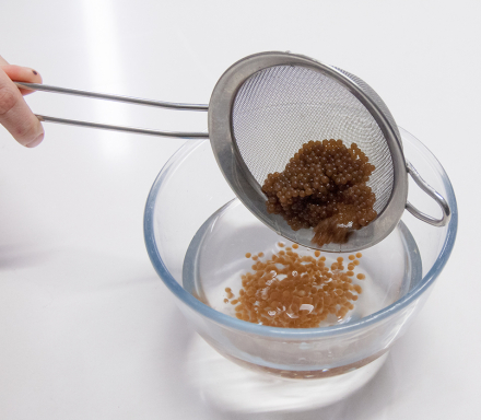 - Retirar las esferas gelificadas con la cuchara perforada para esferificación o con un colador de malla fina y disponer en un baño de agua en un bol a temperatura ambiente para eliminar restos de sabor de cloruro.