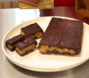 1. En los moldes individuales de silicona colocar mezcla de brownie, relleno dubai y tapar con otra capa de brownie. Llenar hasta ¾ del molde