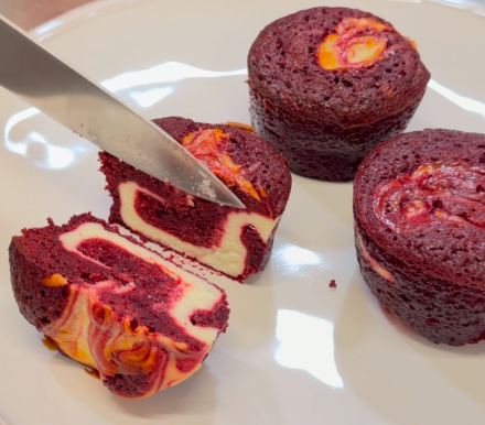 1. En los moldes individuales de silicona intercalar mezcla de brownie y cheesecake. Llenar hasta ¾ del molde
