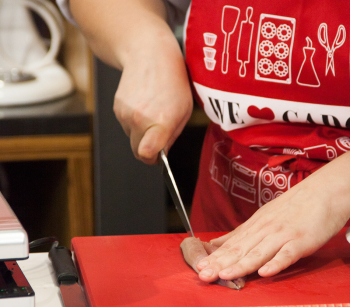 - Limpiar, filetear y desespinar la caballa con pinzas para espinas de pescado o bien haciendo 2 cortes a lado y lado de la fila de espinas central, desperdiciando toda esta mínima parte de espinas y carne. Retirar asímismo con el cuchillo fileteador la parte de la ventresca con espinas, tratando de sacar el mínimo de carne.