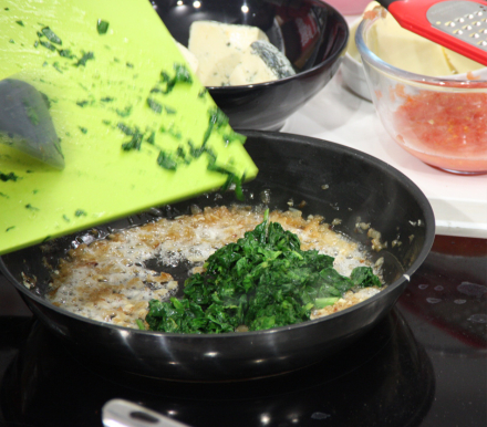 - Picar y sofreír la cebolla hasta que esté bien cocida con aceite de oliva. Mientras sacar los troncos de las espinacas.