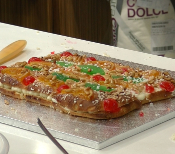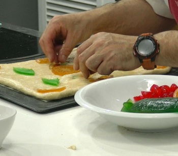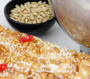 3. Dividir y estirar con el rodillo, disponer la fruta confitada a nuestro gusto y los piñones.