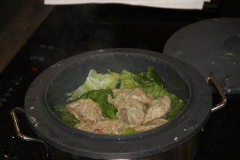 - Cocer las gyozas en la vaporera de Lékué colocando hojas de lechuga sobre la base perforada. Tapar y cocinar de 8 a 10 minutos.