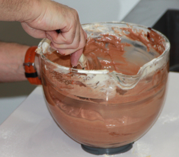 5. Integrar el chocolate fundido con la mantequilla al batido a hilo mientras mezclamos suavemente con espátula lengua de silicona. Mezclar hasta obtener una masa homogénea.