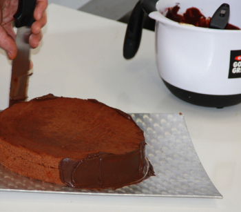 2. Cubrir el pastel con una capa homogénea de ganache, con la ayuda de una espátula de acero con ángulo.