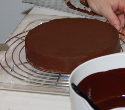 6. Glasear la tarta congelada cuando el glaseado esté a unos 35-40ºC, tirándolo sobre la tarta y retirando el exceso con una única pasada de espátula de acero.