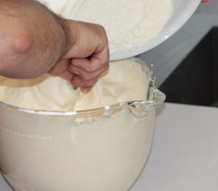 3. Incoporar al batido los sólidos tamizados (harina e impulsor) poco a poco y con movimientos envolventes.