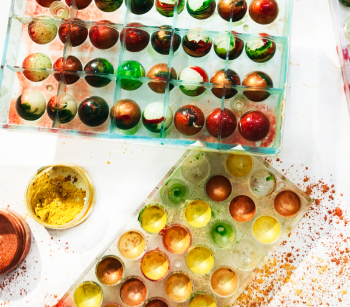 Por otra parte, utilizaremos la colección de moldes de bombones de silicona para dar la forma final, con relleno interior de ganache en gustos variados y sorprendentes. Y daremos un acabado espectacularmente brillante y en combinaciones de colores, formando bombones mágicos como auroras boreales.