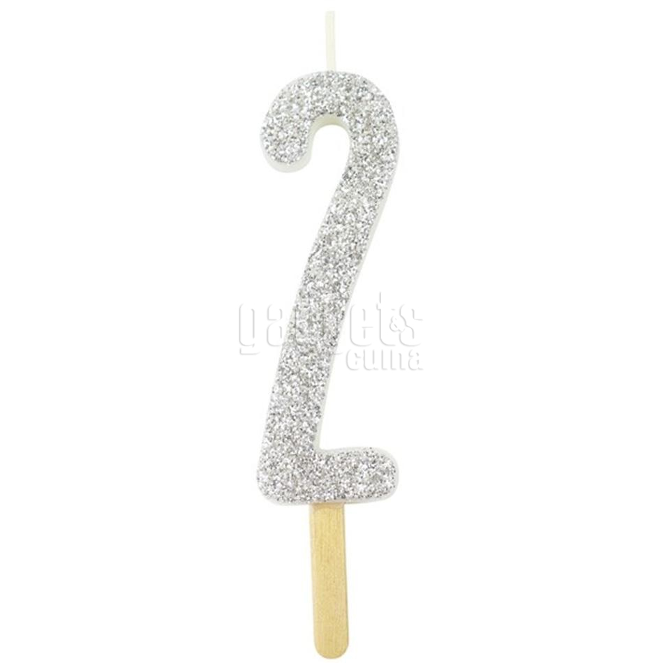 Vela d'aniversari platejada amb el número 2. El color platejat d'aquestes magnífiques espelmes banyades en purpurina decorarà els teus cupcakes i pastissos d'aniversari com mai.