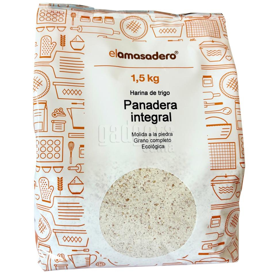 Farina panadera integral ecològica d’El Amasadero, una farina de blat panificable molt aromàtica i nutritiva. A diferència de la farina convencional, que es mol amb corrons industrials d’acer, la farina ecològica es mol a la pedra de manera artesanal, cosa que permet conservar millor el germen del blat. Aquest tipus de farina, de textura gruixuda, és perfecte per elaborar pans d’estil rústic.